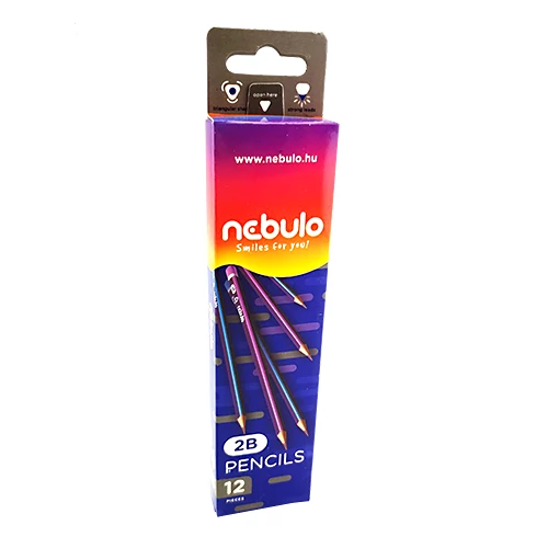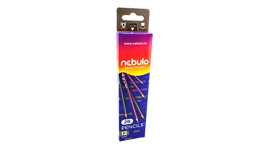 12 db ceruza van egy dobozban, 6 db kék csíkos és 6 db lila csíkos, vonalkóddal ellátva.