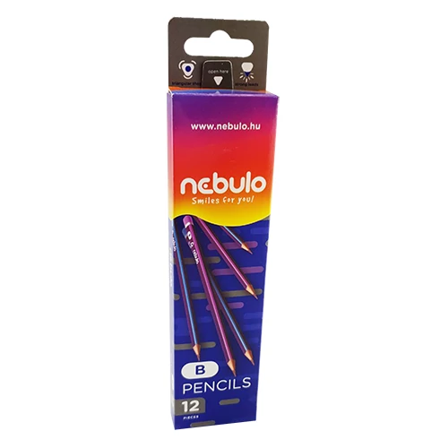 12 db ceruza van egy dobozban, 6 db kék csíkos és 6 db lila csíkos, vonalkóddal ellátva.