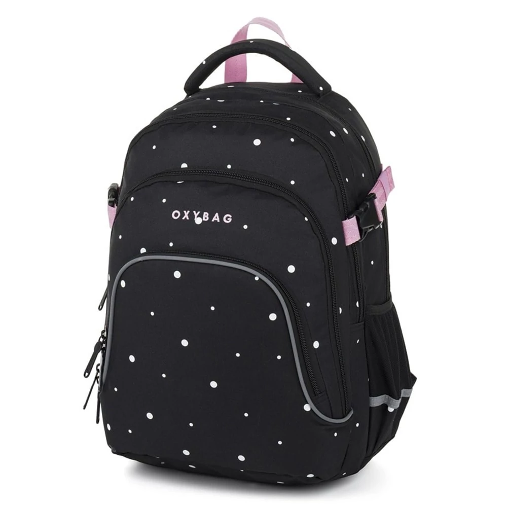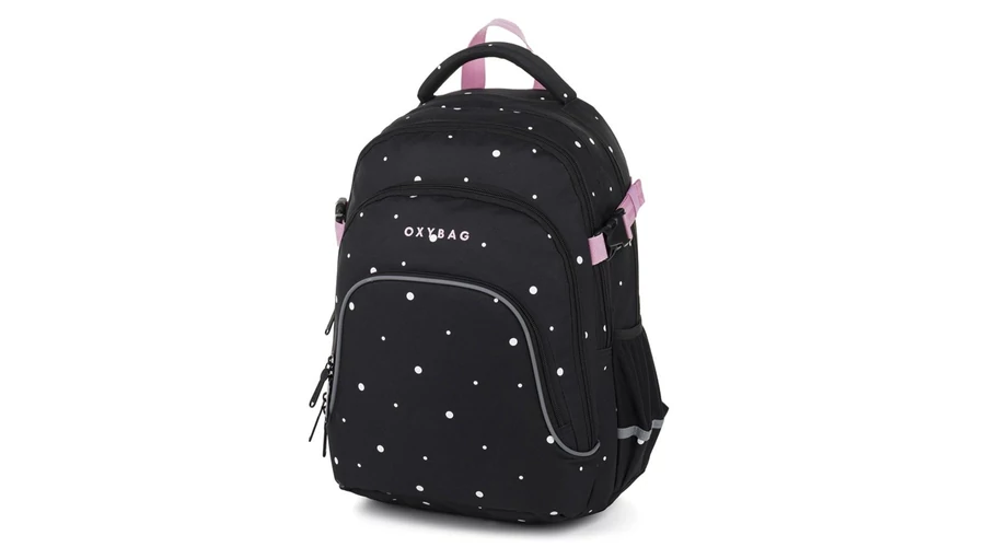 Az OXY Scooler hátizsák ideális választás 3. osztálytól azoknak, akiknek minden fontos dolognak helyet kell találniuk. A háromrekeszes kialakítás bőséges teret kínál tankönyveknek, füzeteknek és uzsonnának. Beépített rendszerező, belső zseb és laptoprekesz is található benne. Az oldalzseb tökéletes kulacsnak, a kulcs- vagy chip-tartó pedig megkímél a keresgéléstől. Az anatómiailag formázott, légáteresztő hátrész, az állítható vállpántok és a mellkaspánt hosszabb viselésnél is kényelmet biztosítanak. A megerősített, vízálló alj védi a tartalmat a nedvességtől, a fényvisszaverő elemek pedig növelik a biztonságot. Űrtartalom: 28 l, teherbírás: 8 kg.