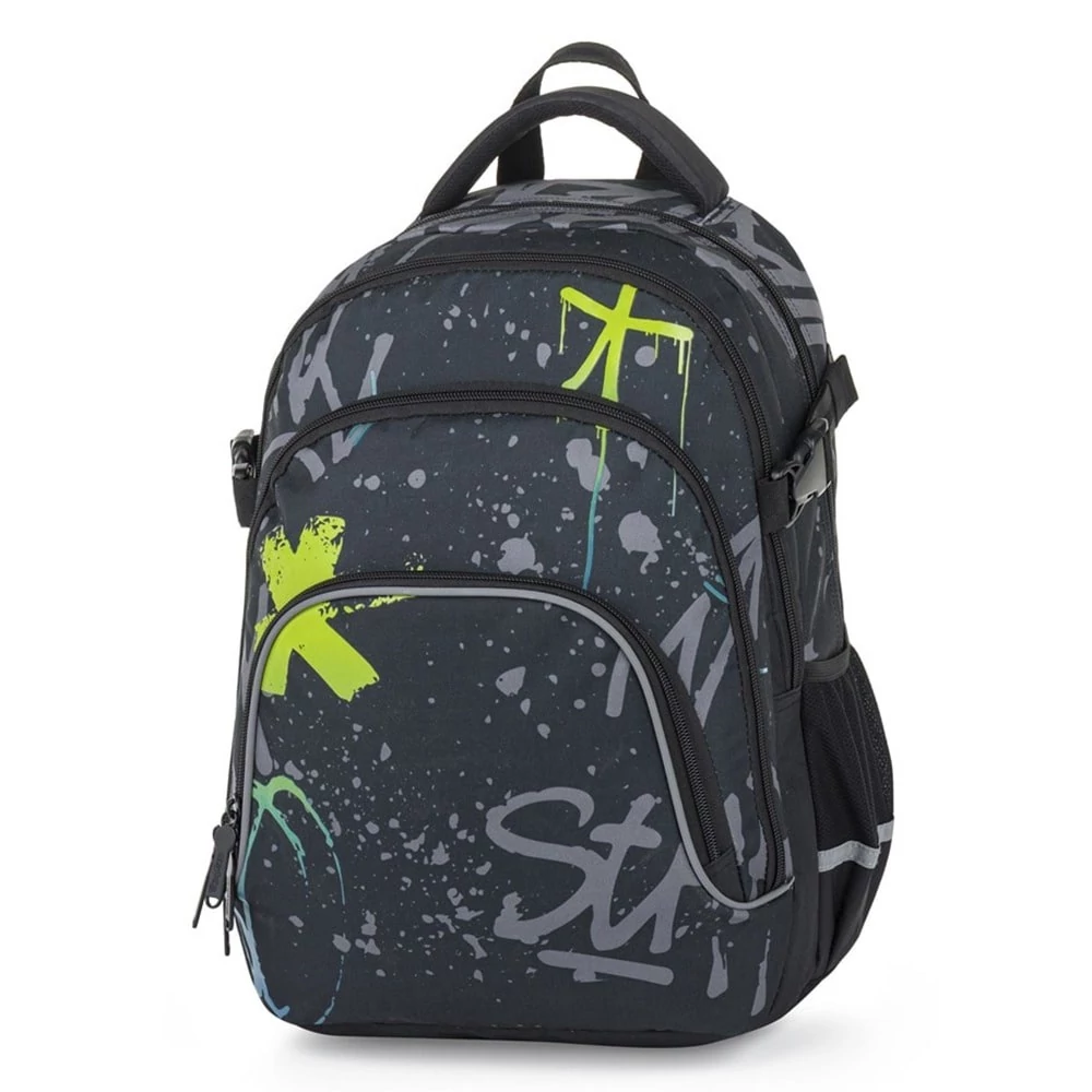 Az OXY Scooler hátizsák ideális választás 3. osztálytól azoknak, akiknek minden fontos dolognak helyet kell találniuk. A háromrekeszes kialakítás bőséges teret kínál tankönyveknek, füzeteknek és uzsonnának. Beépített rendszerező, belső zseb és laptoprekesz is található benne. Az oldalzseb tökéletes kulacsnak, a kulcs- vagy chip-tartó pedig megkímél a keresgéléstől. Az anatómiailag formázott, légáteresztő hátrész, az állítható vállpántok és a mellkaspánt hosszabb viselésnél is kényelmet biztosítanak. A megerősített, vízálló alj védi a tartalmat a nedvességtől, a fényvisszaverő elemek pedig növelik a biztonságot. Űrtartalom: 28 l, teherbírás: 8 kg.