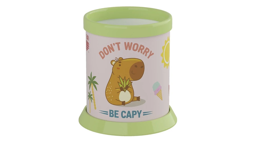 Capybara motívummal díszített, henger alakú asztali írószertartó.