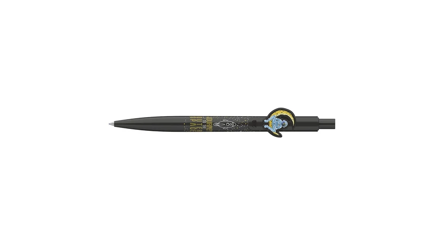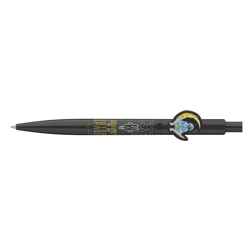 Nyomógombos mechanikával működő golyóstoll, asztronauta fomájú klipsszel. Cserélhető X-20-as kék színű golyósbetéttel. Írásvonalvastagság: 0,8 mm.