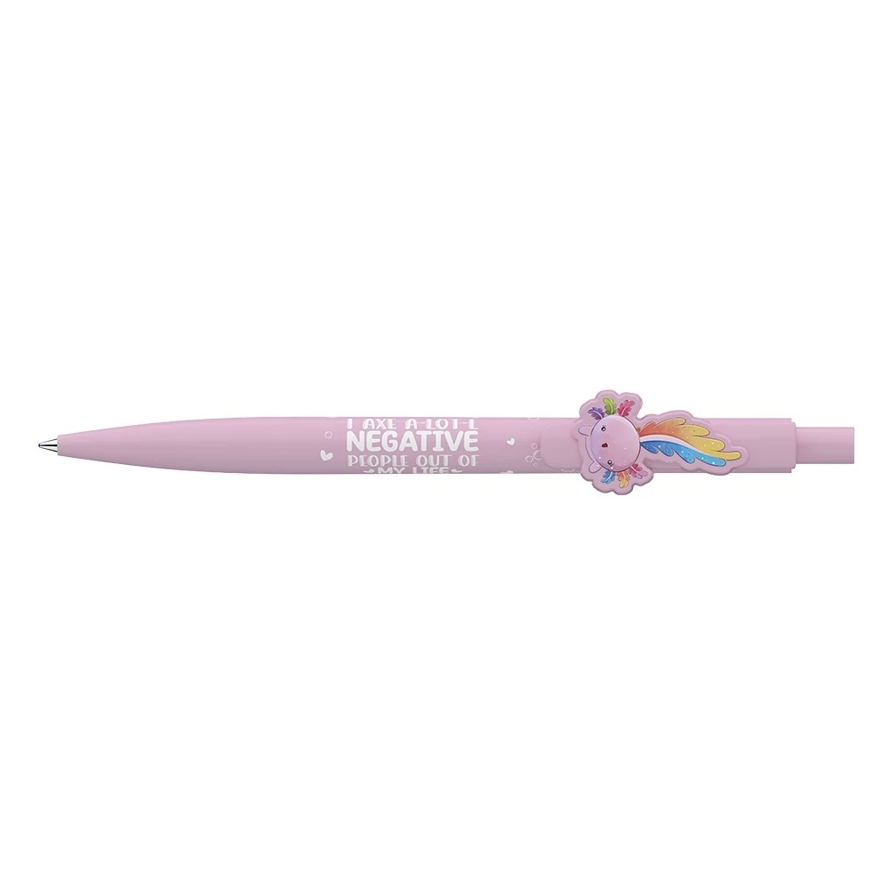 Nyomógombos mechanikával működő golyóstoll, axolotl fomájú klipsszel. Cserélhető X-20-as kék színű golyósbetéttel. Írásvonalvastagság: 0,8 mm.