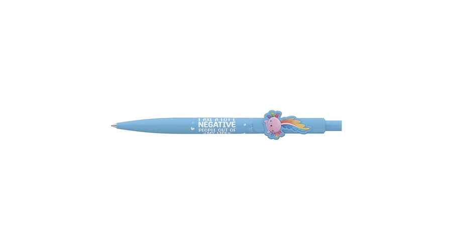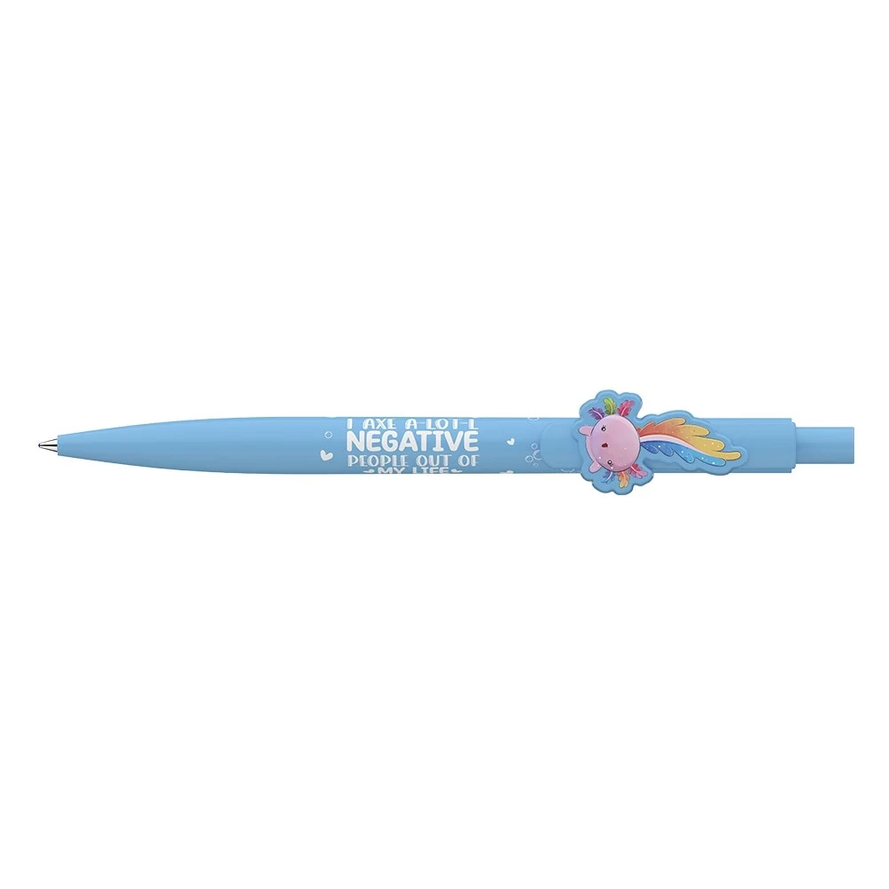 Nyomógombos mechanikával működő golyóstoll, axolotl fomájú klipsszel. Cserélhető X-20-as kék színű golyósbetéttel. Írásvonalvastagság: 0,8 mm.