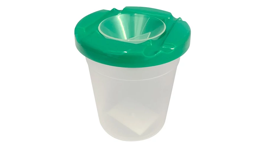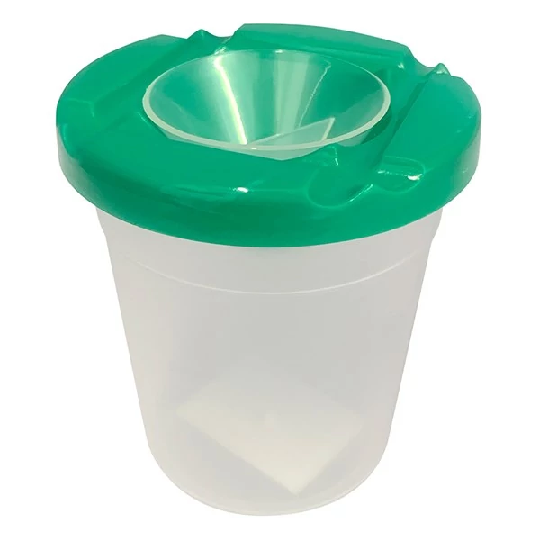 Műanyag ecsetmosó pohár-zöld színű tetővel. A tetőn lévő barázdákba az ecset akár vízszintesen is elhelyezhető. Méret: 7,9 cm x 7,9 cm x 8,6 cm. Súly: 36 gr. Rendelési minimum: 8 db