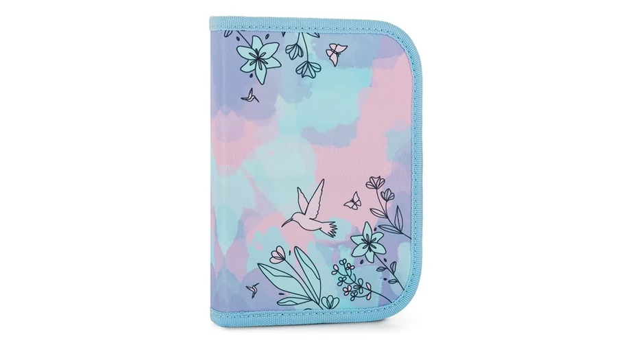 Egyszintes iskolai tolltartó 2 kihajtható füllel, üres. 25 gumipántot tartalmaz az írószerek rögzítéséhez. A belső füleken átlátszó fólia található az órarend számára.