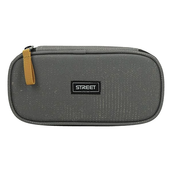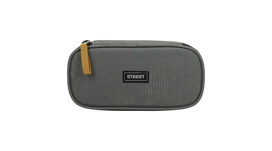 Belül textillel bevont merev lapokkal, gumis kialakítással az írószerek tárolásához, és egy cipzáras belső zsebbel.