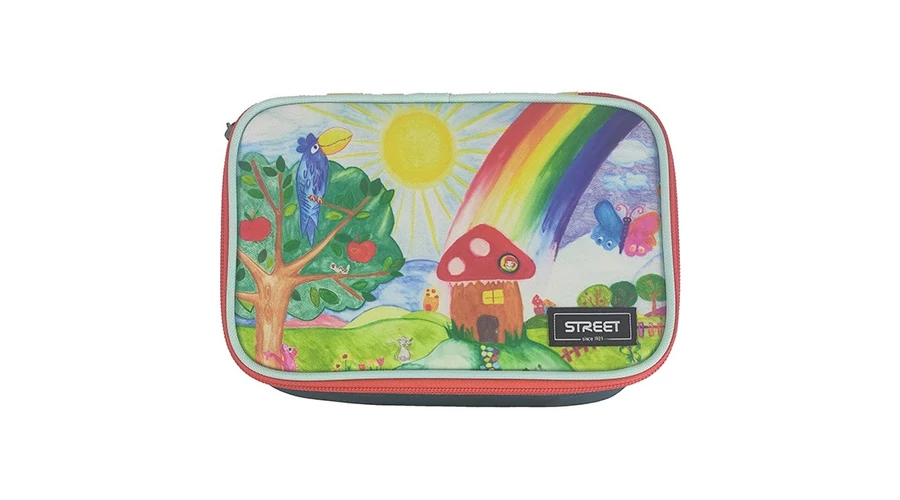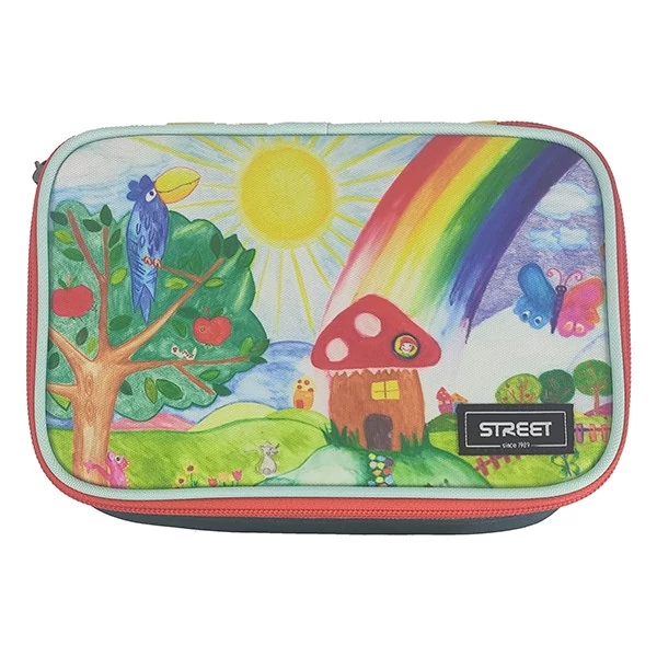 Belül textillel bevont merev lapokkal, gumis kialakítással az írószerek tárolásához, és egy cipzáras belső zsebbel.