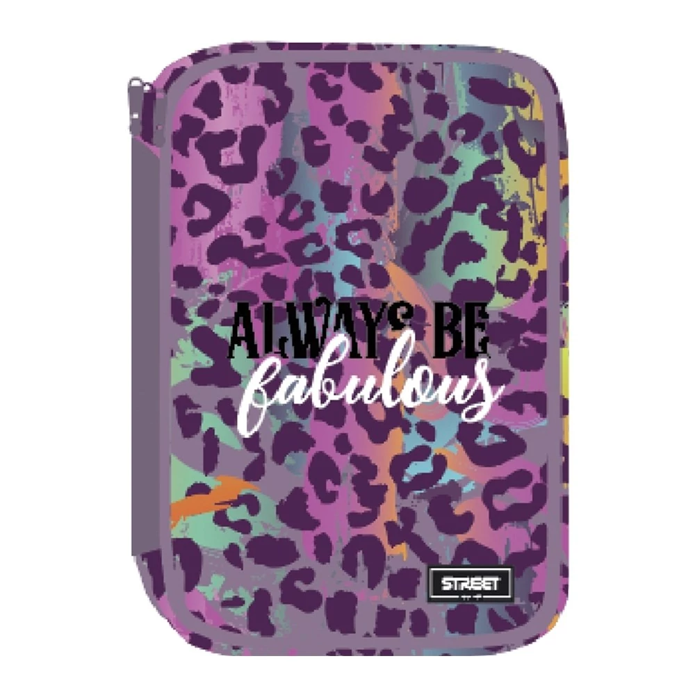 Többszintes írószerekkel töltött, cipzáras tolltartó.