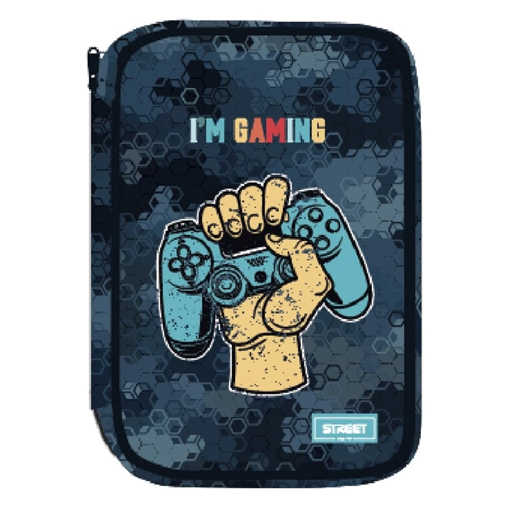 Többszintes írószerekkel töltött, cipzáras tolltartó.