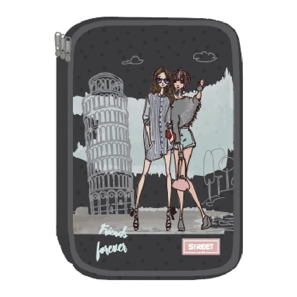 Többszintes írószerekkel töltött, cipzáras tolltartó.