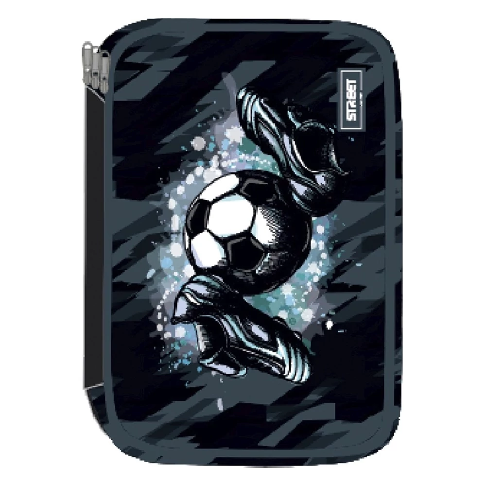 Többszintes írószerekkel töltött, cipzáras tolltartó.